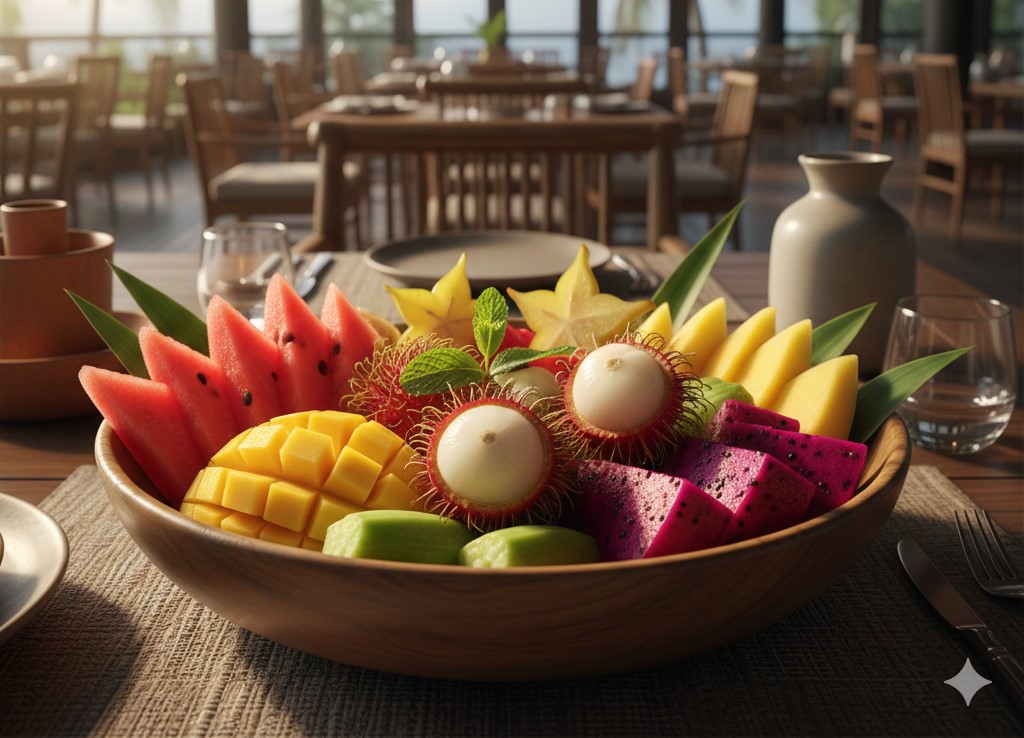 Savoring fresh, local fruits like mangoes, pineapples, watermelon, and bananas while relaxing by the ocean. It’s a refreshing way to complement your meal and enjoy the tropical Zanzibar vibes after swimming or snorkeling.